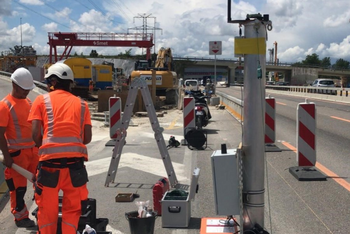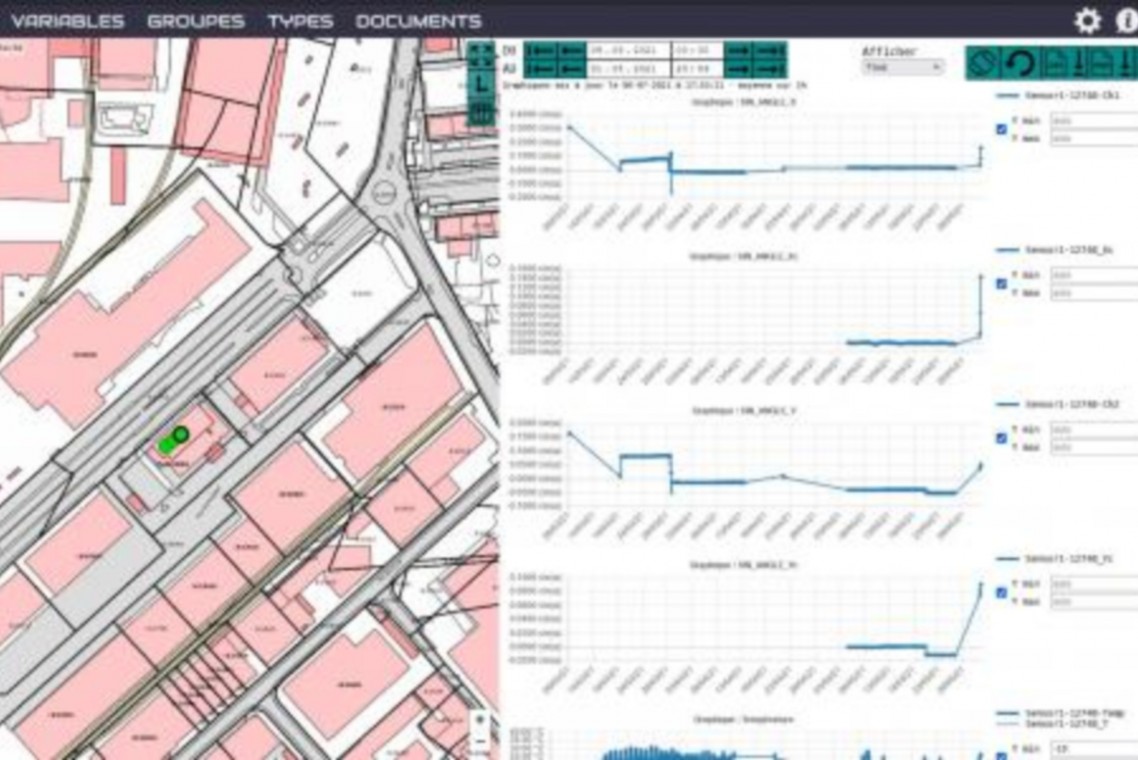 Un premier chantier est en cours d'installation pour le contrôle de déformation d’un mur d’entrée au parking souterrain. Les mesures seront couplées à des mesures ponctuelles topométriques de précision, pour contrôle et comparaison des résultats obtenus.